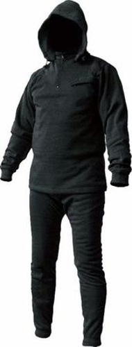 Двухслойная структура материала позволяет надежно удерживать естественное тепло человека, а наличие модифицированного полипропилена в структуре внутреннего слоя, обладающего нулевой впитываемостью, позволяет эффективно отводить излишнюю влагу. Наличие хлопкового волокна делает изделие гипоаллергенным и комфортным в ношении, а структура микроплетения ткани износостойким и долговечным. Комплект состоит из блузона с отстегивающимся капюшоном и штанов.