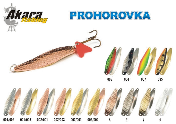 Prohorovka - проверенная временем блесна, которая выручает в самых тяжелых ситуациях уже не одно поколение рыболовов. Ловит любую хищную рыбу, начиная от семги и заканчивая окунем. Многогранна по способам ловли - троллинг и в заброс, в стоячей воде и на течении, каждый рыболов находит этой блесне свое применение.