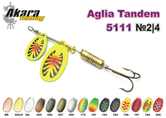 Tandem - классическая вертушка с двумя лепестками формы . Характеризуется увеличенным шумовым и зрительным эффектом. Часто используется при ловле в траве и коряжнике, за счет того, что тандем из двух лепестков припятствует зацепу. Рекомендована для ловли на слабом течении и в стоячей воде.