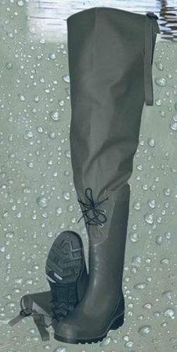 Сапоги рыбацкие с расширенным голенищем. Сапог наполненный с глянцевой поверхностью, протектор с глубоким открытым рисунком. Расширенная надставка сапога фиксируется в области икры при помощи шнурков. Надставка сапога из водонепроницаемого материала. Верхняя часть сапога крепится к ремню брюк регулируемым ремешком на липучке. Цвет изделия: Оливковый. Вес: 2.4 кг. Высота: 900 мм. Материал изделия: ПВХ, Винитол.