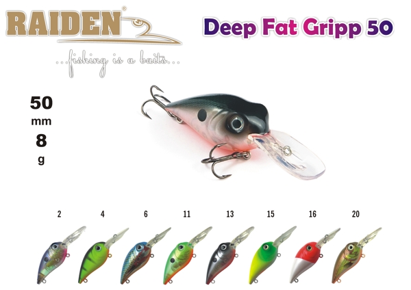 Deep Fat Gripp 50 - легендарная модель Fat Gripp теперь появилась и с удлиненной лопаткой благодаря чему игра воблера стала более размашистой, а следовательно привлекает хищника с больших расстояний. Хорошо зарекомендовала себя при ловле троллингом по теплой воде, когда хищник плохо реагирует на большие приманки. Плавающий. Акустический. Заглубление при ловле в заброс от 0,8 до 2,0 м, при троллинге от 1,6 до 3,2 м.