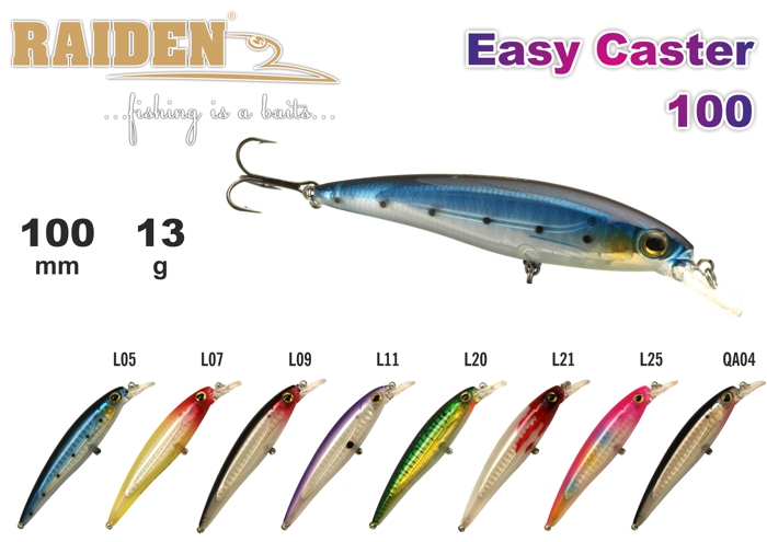 Easy Caster 100 - воблер специально разработанный для дальнего заброса. Имеет стабильную на всех скоростях проводки переваливающуюся с боку на бок среднечастотную порхающую игру. Оснащен системой Magnet Balls. Широкая цветовая гамма максимально приближена к натуральным расцветкам. Наряду с ловлей в заброс, воблер часто используется для троллинга, в виду большой схожести с кормовыми объектами судака и лососевых, ряпушка, рипус и другие. Плавающий. Акустический. Заглубление при ловле в заброс от 0,6 до 1,2 м, при троллинге 0,8 до 1,6 м.