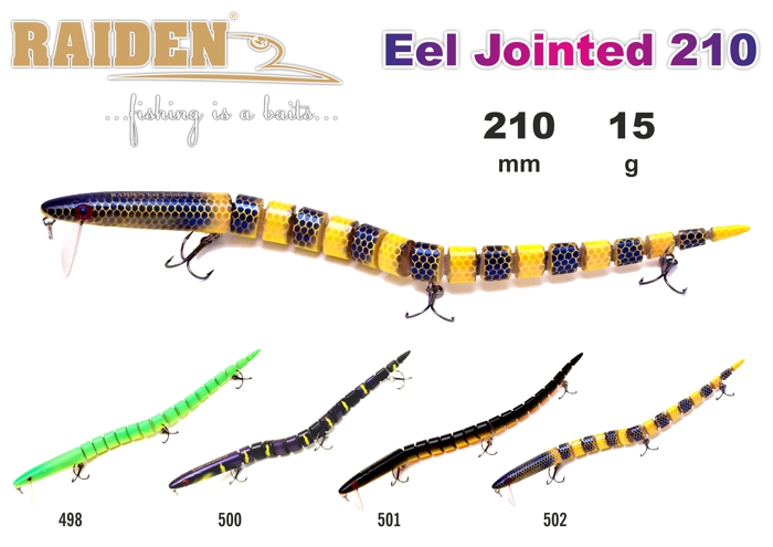 Eel Jointed 210 - эксклюзивный воблер от Raiden, напомонающий по форме своего тела миногу или мелкого угря. Благодаря многосоставному телу и перпиндикулярно расположенной лопасти воблер обладает зигзагообразной игрой с большой амплитудой работы, которая полностью имитирует движения натуральной рыбки. Показал хорошие результаты при использовании рывковой проводки, после потяжки или рывка он начинает медленно тонуть и в этот момент происходит хватка хищника. Особенно эффективен в периоды массового хода миноги или угря на нерест, трофейная щука или судак не пропустят такую добычу.