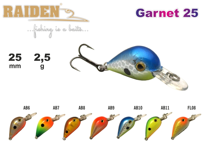Garnet 25 - лайтовый воблер с нехарактерной для данного размера приманок активной размашистой игрой от головы. Стабилен на любых скоростях проводки и рекомендован для всех типов водоёмов. Благодаря особой форме лопасти, которая отбивает подводные препятствия, часто используется при ловле на участках с каменистым дном и на закоряженных участках водоёмов. Основными объектами лова являются форель, окунь, язь, голавль, также возможны поимки леща, красноперки, плотвы, карася, сазана и других относительно мирных рыб. Плавающий. Акустический. Заглубление при ловле в заброс от 0,1 до 1,6 м.