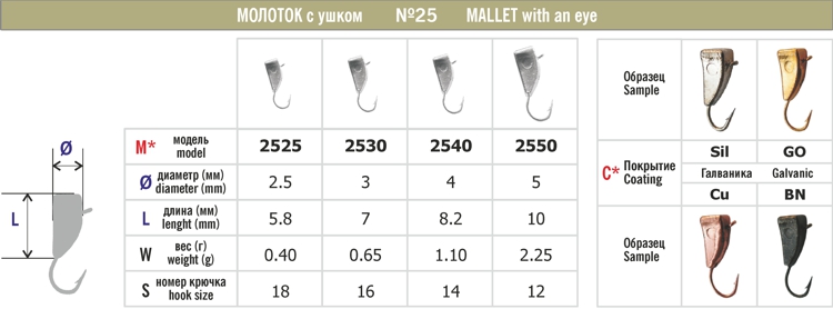 Мормышка МОЛОТОК 25 с ушком (2.5 мм, 0.4 г, цвет: GO)