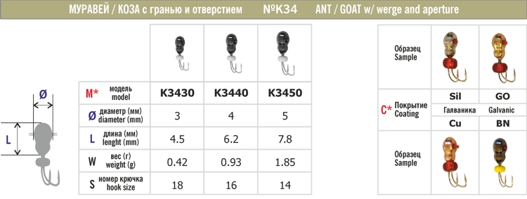 Мормышка КОЗА - МУРАВЕЙ гранёный 34 с отверстием (3 мм, 0.42 г, цвет: CU)