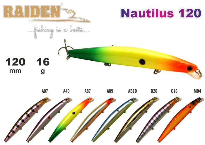 Nautilus 120 - твичинговый воблер от Raiden. Универсален по способу твичинговых проводок. При ловле активной рыбы позволяет делать продолжительный рывок с короткими паузами, что хорошо привлекая рыбу с дальних расстояний. При ловле неактивного хищника, особенно по тёплой, воде хорошо отзывается на короткий рывок с продолжительными паузами. Благодаря отрицательной плавучести позволяет облавливать перспективные окна среди растительности, где ловля другими воблерами затруднена. Тонущий. Акустический. Заглубление при ловле в заброс от 0,3 до 1,0 м, при троллинге 0,5 до 1,2 м.