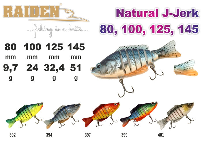 Natural J-Jerk - тонущий многосоставник от Raiden. При правильно подобранной рывковой проводке полностью имитирует поведение раненой рыбки под водой и неизменно провоцирует хищника на хватку. Силиконовый хвост воблера позволяет сделать твичевую проводку наиболее акцентированной и хорошо контролировать приманку. Показывает хорошие результаты при ловле хищника любой степени активности. Цветовая гамма преимущественно состоит из эксклюзивных натуральных окрасок, что помогает с успехом ловить хищника на водоёмах с высоким рыболовным прессингом. Имитирует основную кормовую базу хищников: карася, подлещика, густеру, краснопёрку, окуня. Рекомендован для ловли щуки. Тонущий.