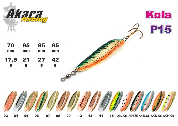 Kola - характерная форма приманки позволяет делать дальний заброс и облавливать самые отдаленные участки, а широкий диапазон расцветок ловить как по теплой, так и по холодной воде с различной степенью освещенности. Большие веса хорошо пробивают струю. Несмотря на то, что это речная блесна, она отлично зарекомендовала себя при ловли на стоячей воде по дальним бровкам. Семга, жерех, щука и другие хищники прекрасно ловятся на эту блесну.