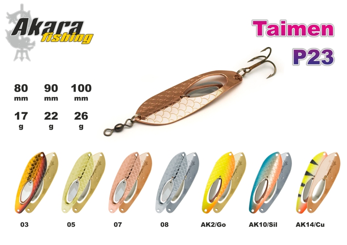 Taimen - эксклюзивная колебалка с лепестком внутри тела. Акустический и визуальный эффекты, которого привлекают рыбу с дальних расстояний и увеличивают количество поклевок. Троллинг и заброс.