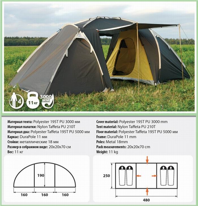 Family название этой палатки говорит само за себя. Большой внутренний объем и функциональность палатки позволяют использовать её в продолжительных поездках. Основное предназначение автомобильный туризм и семейный кемпинг. Палатка имеет две двухместные комнаты и вместительный тамбур, в котором хватит места для вещей и походной кухни. В куполе тамбура располагается дополнительное вентиляционное отверстие, защищенное от осадков съемным козырьком.При помощи двух металлических стоек, дверь тамбура трансформируется в дополнительный навес (козырек) размером 1,6x1,6 м. Входы в комнаты и вентиляционные отверстия защищены противомоскитными сетками. На стенках палатки предусмотрены карманы, под куполом имеется подвесная полочка. Особенности: две отдельные комнаты большой тамбур с двумя входами дополнительный навес над входом хорошо вентилируется дуги увеличенного диаметра высота 1,9м