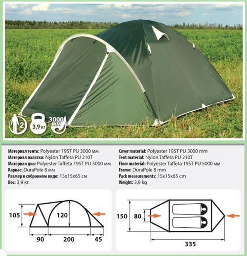 Pamir 2 - универсальная двухместная палатка для туризма, рыбалки, охоты и активного отдыха. Просторная и функциональная, обладает относительно небольшим весом и размером в собранном виде, может с одинаковым успехом использоваться в дальних походах и туристических выездах. Палатка имеет один большой тамбур и два входа, которые продублированы противомоскитной сеткой. Предусмотрены вентиляционные окна, карманы на стенках палатки, под куполом имеется подвесная полочка. Особенности: хорошо вентилируется высокая ветроустойчивость дополнительные штормовые оттяжки два входа один увеличенный тамбур