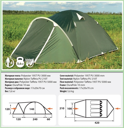 Pamir 4 - универсальная четырехместная палатка для туризма, рыбалки, охоты и активного отдыха. Просторная и функциональная, обладает относительно небольшим весом и размером в собранном виде, может с одинаковым успехом использоваться в дальних походах и туристических выездах. Палатка имеет один большой тамбур и два входа, которые продублированы противомоскитной сеткой. Предусмотрены вентиляционные окна, карманы на стенках палатки, под куполом имеется подвесная полочка. Особенности: хорошо вентилируется высокая ветроустойчивость дополнительные штормовые оттяжки два входа один увеличенный тамбур