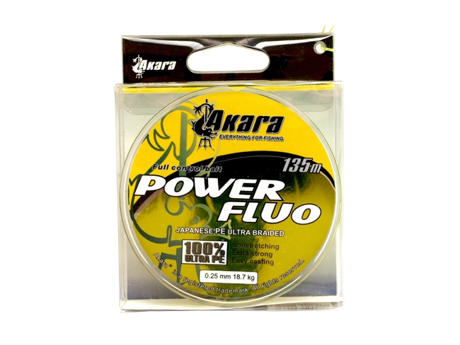 Akara POWER Fluo - универсальный шнур флюоресцентно-жёлтого цвета, что позволяет хорошо контролировать приманку при любой степени освещённости и прозрачности воды. Материал из которого выполнен шнур (высокотехнологичный японский PE ultra) отличается повышенными разрывными нагрузками и не ворсится. Прекрасно подходит как для ловли в заброс, так и для троллинга. Обработан специальной пропиткой, которая позволяет более длинные забросы, увеличивает срок эксплуатации, а при ловли на отрицательных температурах уменьшает обмерзание шнура.