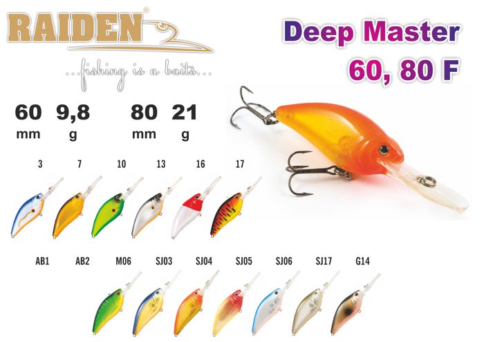 Deep Master - универсальный троллинговый воблер от Raiden. Благодаря сверхострому углу атаки (лопатка воблера расположена практически параллельно телу) имеет высокочастотную игру со средней амплитудой колебаний, что позволяет ему одинаково хорошо ловить, как по теплой, так и по холодной воде. Широкая цветовая гамма, пищевых и раздражающих расцветок, делает возможным использовать этот воблер при любой степени освещенности и мутности воды. Три акустические капсулы, расположенные в теле приманки усиливают привлекающий хищника эффект. Плавающий. Акустический. Deep Master 60 - заглубление при троллинге от 1,8 до 3,2 м, Deep Master 80 - заглубление при троллинге от 3,0 до 5,0 м.