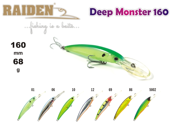 Deep Monster - один из самых глубоководных воблеров в коллекции Raiden. При необходимости, используя тонкий шнур и длинный отпуск приманку можно заглубить до двенадцати метров. Обладает активной и размашистой игрой. Рекомендован для ловли глубинной щуки. Нетрадиционный способ использования данного воблера - при троллинге его ставят в килеваторную струю, регулируя отпуском глубину его погружения (например, при отпуске 15 метров, он заглубляется на 4 метра.), а на крайние спиннинги ставят приманки меньшего размера. Тем самым активная рыба реагирует на него, подходит, но атакует меньшие по размеру приманки. В данном случае воблер выполняет функцию доджера или флэшера привлекает активную рыбу с дальних расстояний. При подходе трофейной рыбы (в основном щуки) поклевка происходит на него. Плавающий. Акустический. Заглубление при троллинге от 4,0 до 8,0 м.