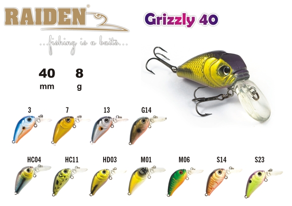 Grizzly - небольшой воблер с лопаткой в половину тела. Характерно небольшой угол атаки, делает игру данного воблера рыскающей и скачущей, что провоцирует на хватку любую хищную рыбу. Плавающий. Акустический. Заглубление при ловле в заброс от 0 до 1,2 м.