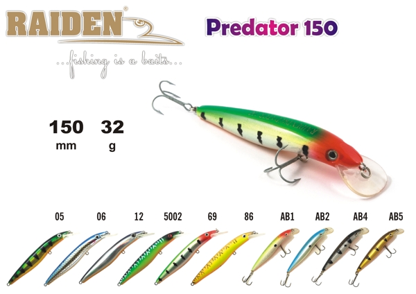 Predator - один из самых уловистых воблеров в модельном ряду Raiden. Обладает активной размашистой игрой, благодаря чему отлично ловит, как по теплой, так и по холодной воде. Линейка состоит из четырех размеров, что позволяет подобрать приманку под любую степень активности и размер рыбы. Плавающий. Акустический. Predator 85 - заглубление при ловле в заброс от 0,6 до 1,5 м, при троллинге от 0,8 до 1,8 м, Predator 100- заглубление при ловле в заброс от 1,0 до 2,2 м, при троллинге от 1,5 до 2,8 м, Predator 125 - заглубление при ловле в заброс от 1,2 до 2,5 м, при троллинге от 1,8 до 3,5 м, Predator 150 - заглубление при ловле в заброс от 1,5 до 3,0 м, при троллинге от 2,0 до 4,5 м.