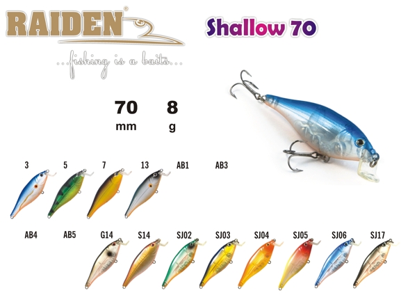 Shallow - классический шад с Z-образной лопастью. Имеет высокочастотную игру с небольшой амплитудой колебания, переходящей в режим мелкого дрожания. Используется для ловли на течении в независимости от его скорости и на стоячей воде. Рекомендован для ловли щуки, судака, окуня. Плавающий. Акустический. Заглубление при ловле в заброс от 0 до 0,8 м, при троллинге от 0,6 до 1,4 м.