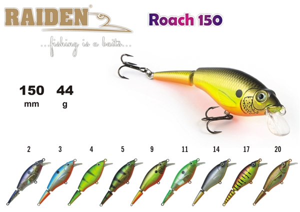 Roach - составной воблер семейства шад с классическим креплением лопаты. Сложная игра этой приманки состоит из среднечастотных, высокоамплитудных, рыскающих колебаний и строго зависит от скорости проводки. При уменьшении скорости проводки, амплитуда колебаний вырастает и воблер начинает активно переваливаться с боку на бок. Хорошо зарекомендовал себя в условиях слабой освещенности и ловле в воде с низкой прозрачностью. Основные объекты лова щука и судак. Плавающий. Акустический. 90 - заглубление 0,6 м 1,1 м (кастинг), 0,8 м 1,4 м (троллинг), 120 - заглубление 0,8 м 1,4 м (кастинг), 1,2 м 2,2 м (троллинг), 150 - заглубление 1,2 м 2,4 м (кастинг), 1,6 м 3,0 м (троллинг).