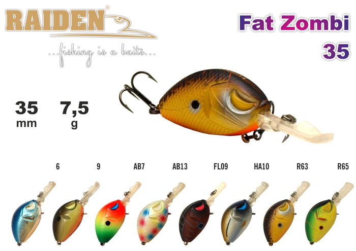 Fat Zombi 35 - воблер с необычной формой лопатки, имеющий рассекатель струи. Тело воблера имеет форму fat crank, такое сочетание позволило создать модель, обладающую среднеразмашистой скачкообразной игрой, с углом наклона при проводке в 45 градусов. Такая проводка позволяет воблеру преодолевать водные препятствия, не цепляясь за них, т.е. отбивать водные препятствия лопаткой. Рекомендован для ловли щуки, окуня, язя, голавля, форели, хариуса, судака. Плавающий. Акустический. Заглубление при ловле в заброс от 1,2 до 2,0 м, при троллинге от 1,8 до 3,0 м.