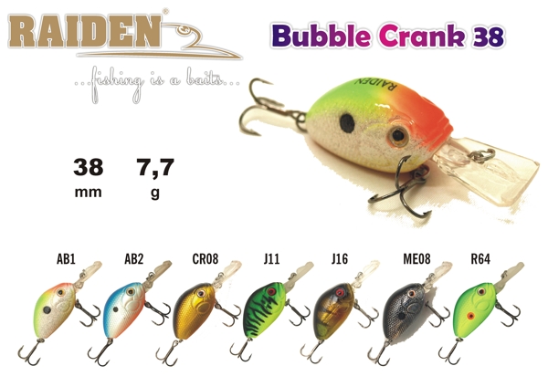 Bubble Crank - воблер с необычной формой лопатки, имеющий рассекатель струи. Тело воблера имеет форму fat crank, такое сочетание позволило создать модель, обладающую среднеразмашистой высокочастотной игрой, с углом наклона при проводке в 45 градусов. Такая проводка позволяет воблеру преодолевать водные препятствия не цепляясь за них, т.е. отбивать водные препятствия лопаткой. Рекомендован для ловли щуки, окуня, язя, голавля, форели, хариуса, судака. Плавающий. Акустический. Заглубление при ловле в заброс от 0,6 до 1,5 м, при троллинге от 1,2 до 2,4 м.