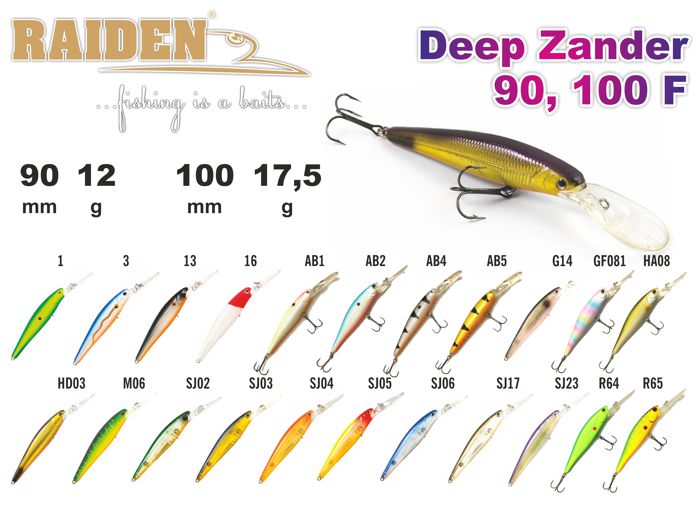 Deep Zander - судаковый воблер от Raiden. Характеризуется высокочастотной игрой со средними колебаниями. Прогонистое тело приманки идеально подходит для ловли судака. Плавающий. Акустический. Deep Zander 90 - заглубление при троллинге от 2,0 до 3,5 м, Deep Zander 100 - заглубление при троллинге от 2,8 до 4,5 м.