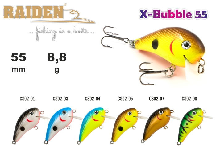 X-Bubble 55 - оригинальный фат с активной рыскающей игрой от головы. Рекомендован для ловли практически всех хищников. Щука, окунь, голавль, жерех, судак, язь, вот неполный перечень всех любителей поохотиться за данной приманкой. Основное предназначение это ловля в заброс на стоячей воде или слабом течении, однако, популярным так же является ловля на быстром течении методом сноса воблера при остановке проводки. Широкая цветовая гамма включает в себя основные пищевые и раздражающие окраски и позволяет подобрать воблер под любую степень освещённости и прозрачности воды. Плавающий. Заглубление при ловле в заброс от 0,0 до 0,2 м.