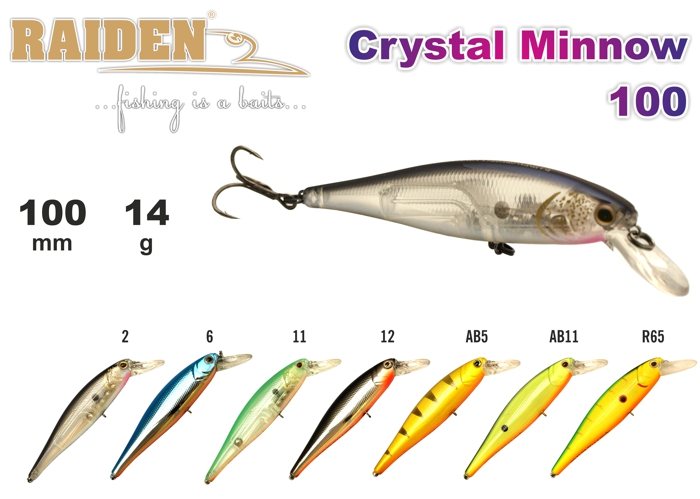 Crystal Minnow 100 - классический миноу со среднеразмашистой игрой, который не пропустит не один хищник. Одна из первых моделей в линейке воблеров Raiden и по сей день с успехом ловит рыбу. Плавающий. Акустический. Заглубление при ловле в заброс от 0,6 до 1,4 м, при троллинге 0,8 до 2,0 м.