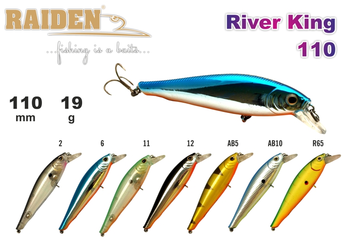 River King 110 - воблер, с танцующей игрой от головы, идеально подходящий для ловли на течении. Хорошо зарекомендовал себя при ловле щуки, судака и крупного жереха. При использовании проводки с продолжительными остановками эффективен на водоёмах с большим рыболовным прессингом и в периоды слабого клёва. Рекомендован для ловли по холодной воде. Плавающий. Акустический. Заглубление при ловле в заброс от 0,8 до 1,5 м, при троллинге 1,2 до 2,5 м.